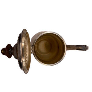 This elegant silver soldered teapot is in good condition. However, it does show signs of wear as it is expected of its vintage age like stains, scratches, tarnishing. Please refer to pictures.
