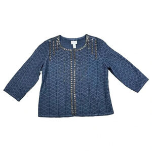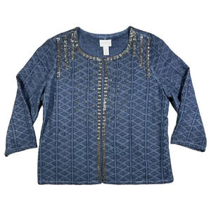 Chicos Blue Studded Beaded Embroidered Eyelet Cardigan Jacket Size 1 US Medium