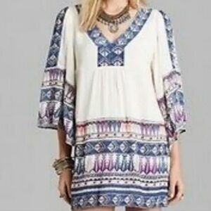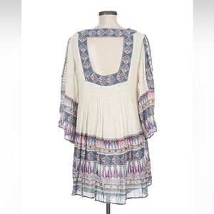 Free People Terra Nova Boho Embroidered, V-Neckline, Flare 3/4 Sleeves, Back Cutout, Side Pockets, Relaxed Fit Mini Dress