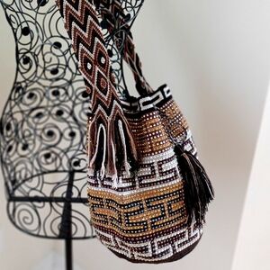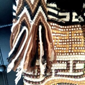 This Wayuu Mochila stunning, embellished with rhinestones, ethically-produced bucket bag is one-of-a-kind. Each bag is made by hand and unique in its color and design. lt is made within a fair trade cooperative in Colombia and represents approximately 5 to 7 days of work for a single artisan and combines sustainability, quality, design and style.