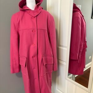 Make a bold statement with this vibrant, retro-inspired Isaac Mizrahi for Target hooded coat! Crafted from a warm and soft wool blend in a stunning fuchsia/hot pink hue, this piece is perfect for adding a pop of color to any winter wardrobe and outing. The coat is in excellent condition.