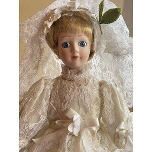 BRIDE Porcelain Doll Wedding Dress Veil Flowers Blonde Hair Blue Eyes Boots 17in