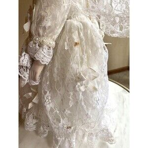 Wedding lace dress with bows and beads, wedding veil has floral headband, holding a flower bouquet, booties, pantaloons. Porcelain face, hands, legs with cloth body
