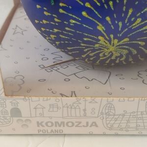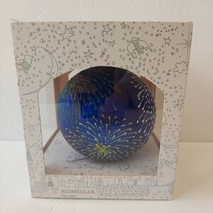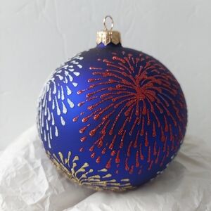 Gorgeous Komozja Handpainted Hand Blown Blue Ball Glass Christmas Ornament, Features a vibrant Intricate Blue Ball w/ White, Green,Red Fireworks design w/ Glitter, Size: 6"×6", Very good condition, Made in Poland, this Ornament brings a touch of traditional charm to the Holiday season,