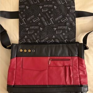 Go where no man or woman has gone before with this super cool and stylish laptop messenger bag that features details from Star Trek: The Next Generation (STTNG) command division uniforms! It has a metal comm badge pin and metal rank pips. Note on the rank pips…it looks like you’ll have to settle for a rank below Captain as one of the pips was removed originally and I can’t find it now. The interior features a cool STTNG print, a lot of interior pockets for smaller items, and a couple of larger pockets for a laptop and/or tablet. The bag measures roughly 13” tall and 17” wide. This item has only been used once and needs a new home to be truly appreciated! Comes from a smoke-free home.