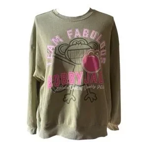 Cute and nostalgic Bobby Jack “Team Fabulous” crewneck sweatshirt in an olive green color with pink graphic detailing. Super cozy fleece-lined interior — perfect for Y2K lovers or anyone who grew up with this iconic character!