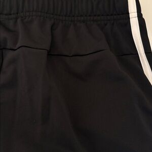 Stylish black track pants featuring white stripes. Perfect for casual wear or workouts.