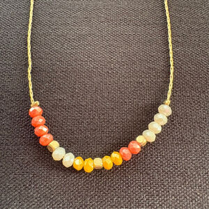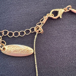 This is a new Plunder gold-tone necklace featuring a delicate chain and a curved arrangement of faceted beads in shades of coral, cream, and yellow. The beads are strung along the center of the chain, creating a subtle pop of color. The necklace has an adjustable lobster clasp closure with an extender chain and a small oval charm engraved with "Plunder." It is presented on a brown card with the Plunder logo.