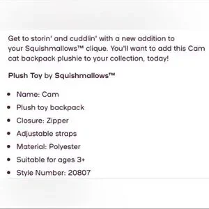 SQUISHMALLOW CAM THE CAT 12" BACKPACK PLUSH TOY NEW WITH TAG