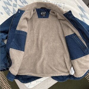 Classic denim jacket with warm sherpa lining. Features buttoned chest pockets and a cozy collar. Ideal for layering in cooler weather.