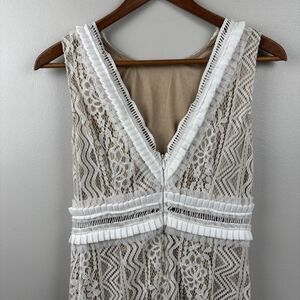 The dress has a long length and is designed in a fit & flare, maxi, mermaid, sheath, and bodycon style. It comes in a beautiful white nude lace fabric, with ruffle and layered accents for added texture. The dress is perfect for the summer, fall, and spring seasons, and is available in a size SMALL