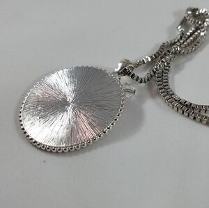 25" long excluding the pendant, silver tone pendant, chain and clasp, crystal red, white and blue beads