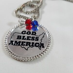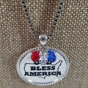 This is a Handcrafted chain Pendant Necklace with a beaded charm. The pendant is engraved with the phrase “God Bless America.”