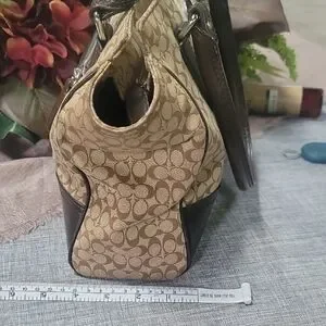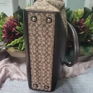 Stylish Coach satchel with signature pattern. Features brown and black tones. Elegant and versatile design.