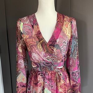 Chic maxi dress with vibrant paisley print. Features long sleeves and a wrap style. Perfect for adding flair to any event.