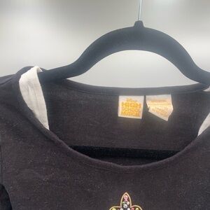 This is a must-have Disney High School Musical long-sleeve shirt in size L 12/14. The black shirt has an eye-catching design, with its shimmering gold letters and studded sequence that add a touch of glamor to your wardrobe. The shirt also features a white underlay that complements the black and gold color scheme. Made of 100% cotton, this shirt is stylish and comfortable to wear. It is in great pre-loved condition, so you can enjoy wearing it without any worries. Whether you're a High School Musical franchise fan or love unique and trendy clothing, this shirt is perfect!