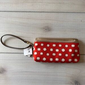 Orange, tan and cream colorings. 2 zipper pouches. And one long slip in pouch on exterior. Gold leather handle. Interior has 3 large slip in pockets for bills. 6 slip in credit card pockets. Canvas exterior. Retails for $118. Brand new with tag. Measures approximately 8.5" wide by 5.5" high