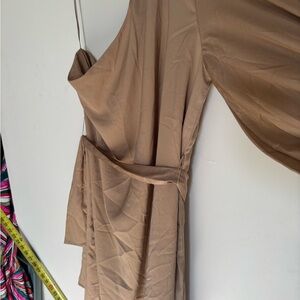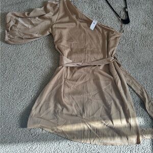 Chic one shoulder dress by Banana Republic. Soft tan fabric. Stylish and versatile.