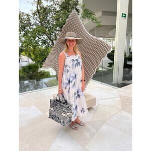 Elevate your summer wardrobe with the BOSS 100% linen floral midi dress in size US 4, showcasing a serene blue botanical print on crisp linen fabric. Designed with a flattering square neckline and sleeveless silhouette, this pull-on shift-style dress delivers effortless elegance. The open-waist detail subtly enhances your shape, while the high-quality linen ensures breathability and lightness—perfect for warm days. Its midi length balances casual charm with refined sophistication, ideal for brunches, garden parties, or day-to-evening transitions.