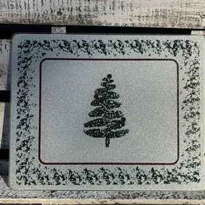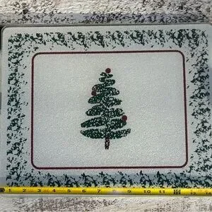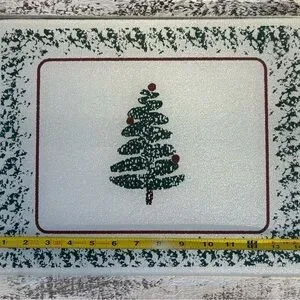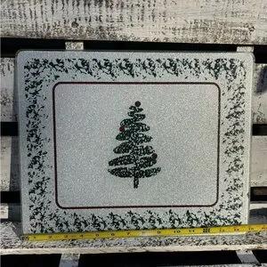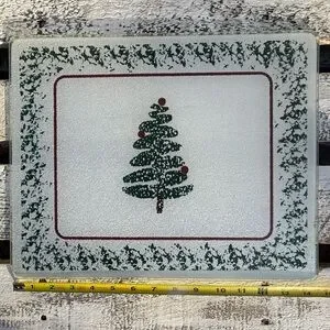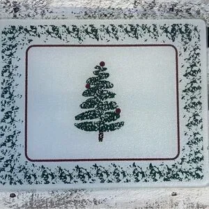 Elegant and sparkly glass cutting board with festive design. Very similar to the modern, minimalistic Furio ( Italy) Christmas tree design of platters and dishes. All bumper feet are attached. Ideal for holiday parties and gatherings. Gently used vintage item. See photos for slight flaws and measurements.