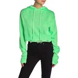 Stand out among the crowd in this vibrant distressed hooded sweater.