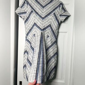 DESCRIPTION: Absolutely GORGEOUS dress. Beautiful pattern and quality. Double pleated sleeves. Zipper and hook eye closure. A-line silhouette.
