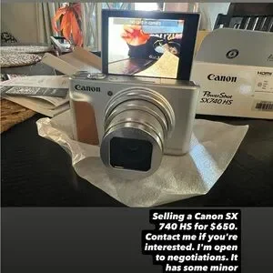 Lightly used Canon PowerShot SX740 HS in Excellent Condition. Used only 5–7 times total for trips, parties, and concerts. Minor scratches, but everything works perfectly.Flip screen makes it perfect for content creation, travel, or casual photography. Shoots crisp 4K video and has 40x zoom. Willing to negotiate.
