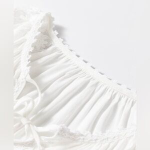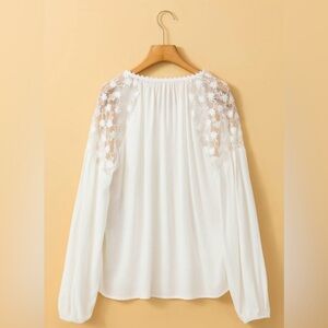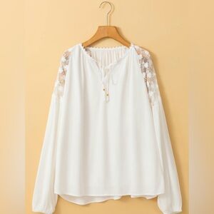 This elegant white blouse features delicate lace detailing on the sleeves, perfect for a sophisticated look. Ideal for both casual and formal occasions.