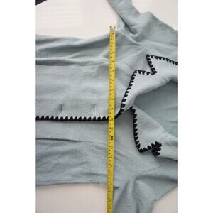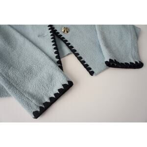 Elegant light-blue knit with St. John’s signature structure and drape. The contrast black trim gives it a crisp, tailored edge, and the gold buttons add that unmistakable polished finish. Soft, medium-weight, and beautifully made.