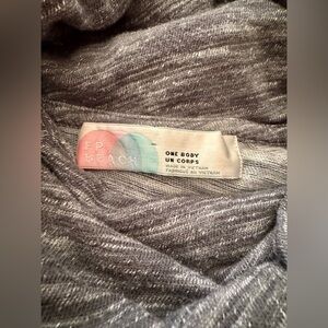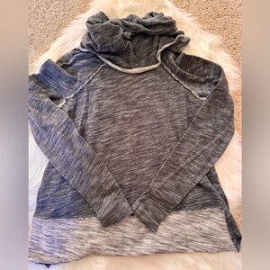 Is has a 2 toned Heather Gray Knit material, long sleeves, cowl funnel cocoon neck and pullover style. In excellent condition!