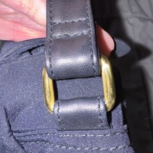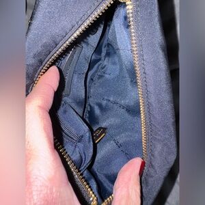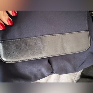 Chic crossbody bag with a sleek design. Features a navy fabric body and black leather accents. Ideal for versatile styling.