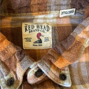 Cozy and durable RedHead plaid flannel shirt in a brown, orange, and white check pattern. Classic button-up style with two button-flap chest pockets. Soft, warm, and perfect for fall, winter, or outdoor wear.