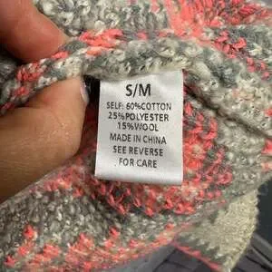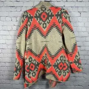 Wishlist Aztec Print Open Front Cardigan, size S/M, in a vibrant coral, gray, and beige color scheme. This stylish cardigan features an eye-catching Aztec pattern throughout, an open front design, and a comfortable shawl collar. Made from a blend of 60% cotton, 25% polyester, and 15% wool, offering warmth and a soft feel. Perfect for layering over casual outfits or adding a bohemian touch to your look. Excellent pre-owned condition with no noticeable flaws.