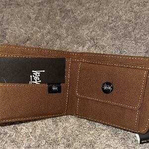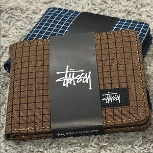 Chic Stussy wallet with a brown plaid pattern. Sleek and modern style.