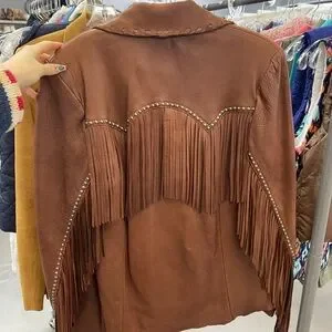 Embrace a western vibe with this brown leather jacket featuring stylish fringe details. Perfect for adding a unique touch to your outfit.