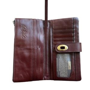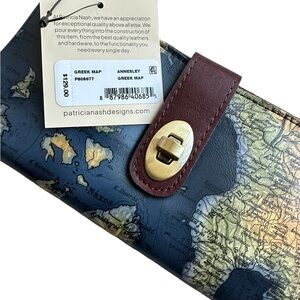 NWT Patricia Nash Annesley Leather Wristlet Wallet in Blue, Yellow. Tan. Print Greece Map. Brass Hardware, wristlet strap (convertible wallet/wristlet strap ticks back into the wallet spine when not in use.) This is a large wallet with a supple flexible leather feel. It’s beautiful!