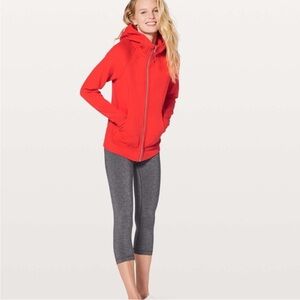 Classic Lululemon Scuba Hoodie in the rare Vivid Flame color, a bold orange red shade. Designed in the full zip classic fit with soft breathable cotton fleece, ribbed side panels for mobility, thumbholes, and a hidden media pocket. Warm comfortable and no longer sold in this color, making it a great find for Lululemon collectors.
