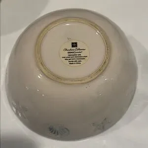 Design: The bowl features a beach or coastal theme with embossed sea creatures like starfish and shells on a cream or white background, often with an aqua blue or light blue rim.