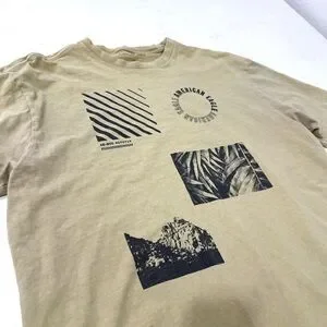 Soft and nicely broken-in graphic tee from American Eagle, featuring a washed light-yellow color and bold black graphic blocks.