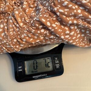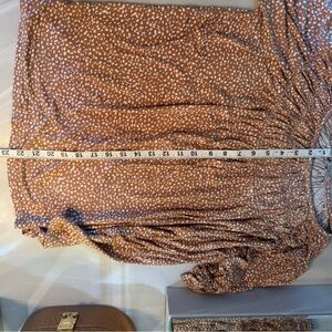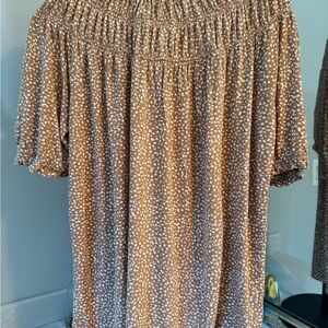 Chic beige top with white dots. Soft fabric and relaxed style.