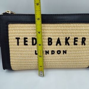 NWT Ted Baker London raffia wristlet brings that effortless British-summer vibe: woven straw-style body, bold black logo lettering, and smooth black faux-leather trim. Lightweight, structured, and perfect for everything from brunch to airport duty-free strutting.