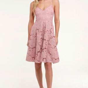 Chic blush lace midi dress with a flattering fit. Perfect for special occasions. In excellent used condition. 17” ptp 31” pit to bottom. Smoke free pet free home.
