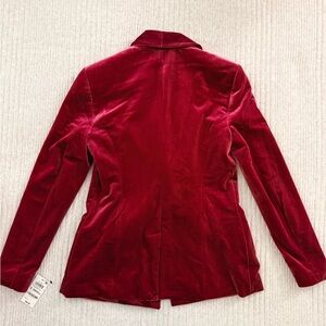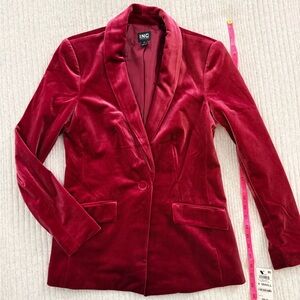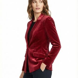 Luxurious red velvet blazer. Perfect for stylish occasions. Soft texture and elegant design.