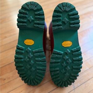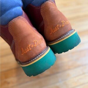 Just Don collab with Timberland! Worn 2 times and in Excellent shape! Cognac color Timberland boots with blue collar and green soles. Gold eyelets and tan accents add style.
