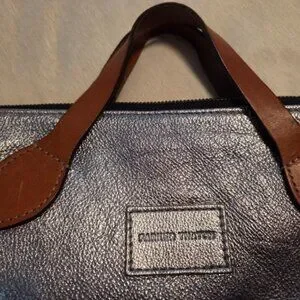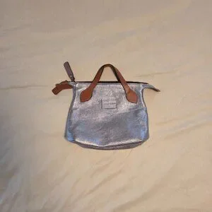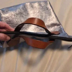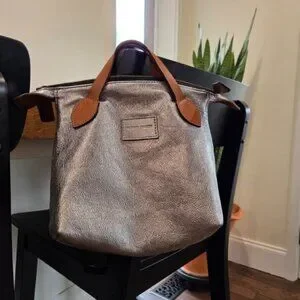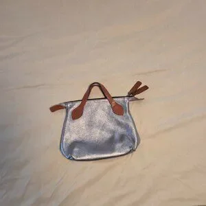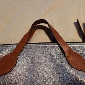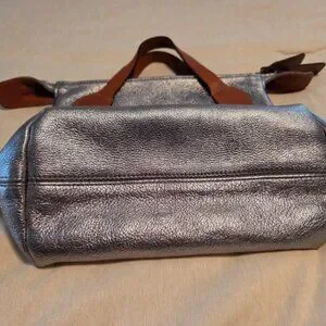 This tote is stylish and versatile, a sliver slouchy tote bag with brown handles is perfect for any occasion. It has a sleek design and durable material make it a must-have accessory. Does NOT come with dust bag. Has 2 small discolored spots, see photo. In excellent used condition.