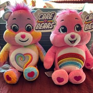 Charming Care Bears plush duo. Features pink and rainbow designs. Perfect for cuddles and play.