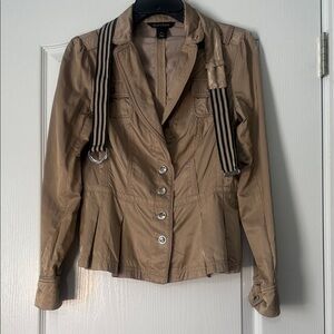 Chic tan blazer with button accents. Tailored fit. Ideal for versatile styling. Reversible Belt. Belt Loop on right side has come unloose. See pics!