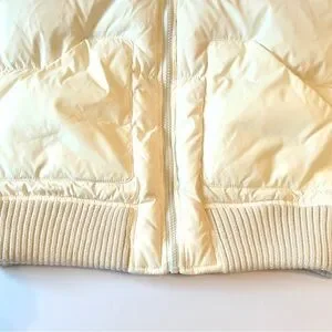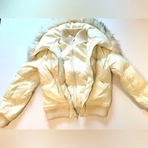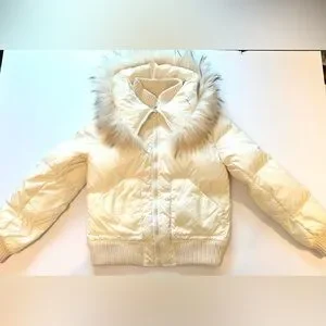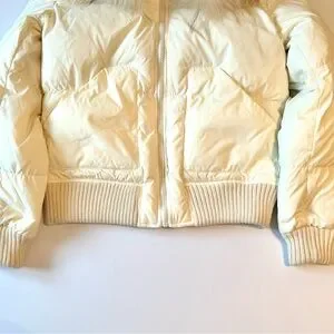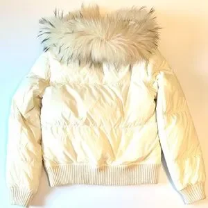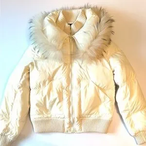 BCBG Maxazria Cream Puffer Down Bomber Style Jacket with Raccoon Fur Collar