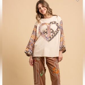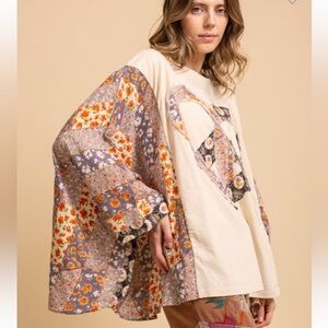 Stylish oversized top with floral heart patchwork and printed kimono sleeves.