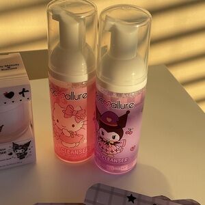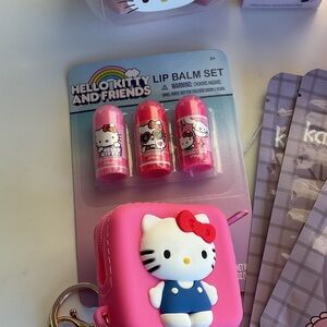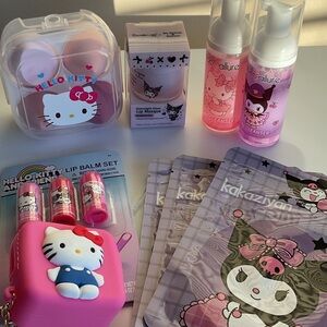 Adorable Hello Kitty & Kuromi themed skincare and accessories set. Includes pink and purple items with cute Hello Kitty designs.
